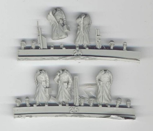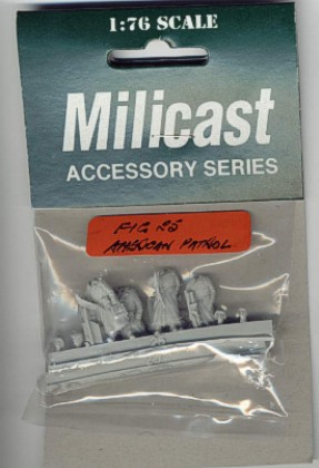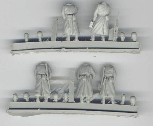 | Kvalita | Tento figurkový set obsahuje celkem 5 detailně propracovaných figurek odlitých z resinu, které představují vojáky americké pěší patroly oblečené v dlouhých kabátech. Všechny stojící figurky jsou “bezhlavé”, protože set obsahuje pro každou z nich dvě alternativní hlavy. Buď si můžete vybrat hlavu s helmou, nebo v pletené čapce. Dvě figurky jsou odlity včetně pušek zbraní a pro další tři jsou zbraně v setu odlity zvlášť (kulomet 30cal, puška a samopal). Některé části figurek jsou zality resinovým filmem, který je však velice tenký a jeho odstranění nebude žádný problém. V mém sáčku jsem nalezl jednu figurku s přelomenýma nohama, odlomenou od licího rámečku (zřejmě vlivem transportu). Tento problém ale jistě vyřeší trocha lepidla. |