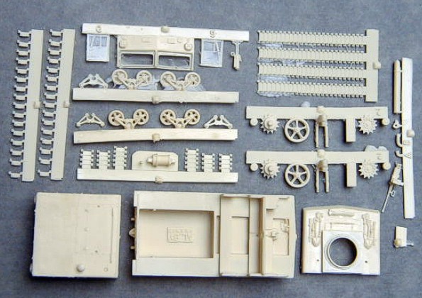 Všechny díly jsou čistě odlity z PU (minimum bublinek) včetně různých detailů – kulomet 12,7 mm, nářadí, mřížky, řadící páka….. Podvozek je odlit z jednotlivých součástí. Dvě verze tažných háků (classe A a B). Bohužel v mé stavebnici chyběl jeden drobný díl. |