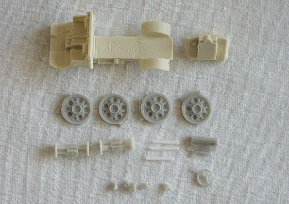 Resinové odlitky podvozku a přední masky jsou velmi jednoduché, bez detailů a místy s drobnými bublinkami. Jejich povrch je velmi hrubý a bude nutné ho začistit. Ostatní resinové díly jsou mnohem kvalitnější. Některé díly mají také malé otřepy a volant je zalit resinovou blánou. Dvě velké leptané planžety, které obsahují díly pro celou korbu a veškeré detaily, bohatě vyvažují nedostatky resinových odlitků. |