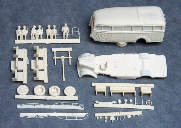 | Kvalita | Díly modelu jsou čistě odlity z PU. Velmi dobře je udělána vlastní karoserie autobusu. Nutné je ovšem odstranění nálitků a propilování oken. Také je nutné srovnání dvou největších odlitků (podvozku a karoserie) v horké vodě. Stavebnice obsahuje figurky řidiče a 6 vojáků. |