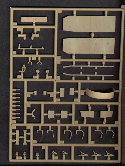 Výlisky z pískově zbarveného polystyrénu jsou rozloženy do 4 rámečků. Model svým pojetím velmi úzce navazuje na předchozí výrobky Revellu, zejména pak Pz 4. Jednotlivé díly jsou vylisovány velmi čistě, bez otřepů a nedolitků. Detaily na povrchu dílů jsou velmi jemné a věrohodné. Jako malý nedostatek bych hodnotil fakt, že část ženijního vybavení je vylisována jako jeden díl společně s blatníky. Oddělené by tyto detaily byly jistě lepší. Naopak velice pěkně se výrobci podařilo znázornit přídavné pancéřování typu “applique” před prostorem řidiče a radiotelegrafisty a před štítem kanónu. Podle mého názoru zatím žádný výrobce tyto díly lépe nezpracoval. Pásy jsou, jak je u Revellu dobrým zvykem, vylisovány z polystyrénu a rozděleny na několik úseků. Model představuje pouze jednu variantu a to Ausf. M s představnými pancíři na korbě i věži. Nabízí se zde možnost konverze na verzi N s 75 mm krátkohlavňovým kanónem, možná je i mírně náročnější přestavba na předchozí verzi Ausf. L. Starší verze jdou konvertovat již poměrně složitě, zejména pro nutnost výroby nových krytů motorového prostoru. ( Pozn. : Pro toho, kdo by si rád postavil některou ze starších verzí, zejména Ausf. G,H a J, je výhodnější (a snadnější) použít za základ model fy Fujimi, který má tuto partii navrženou šikovněji. Jen je nutno smířit se s nižší kvalitou a měřítkem, které je uváděno jako 1/76, ale ve skutečnosti je spíše 1/74 ). Obrysová věrnost modelu je velice přesná. |