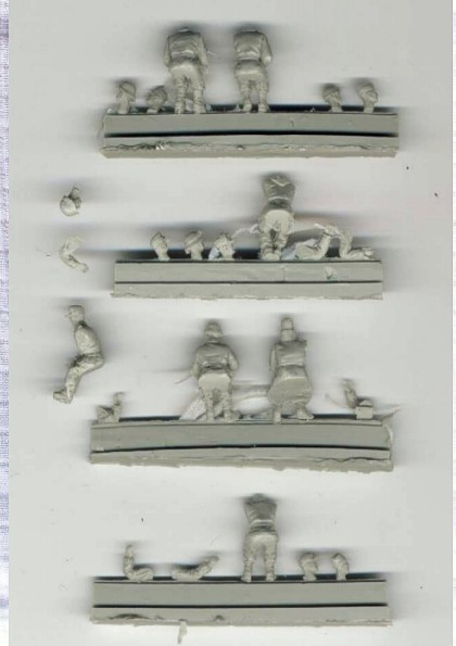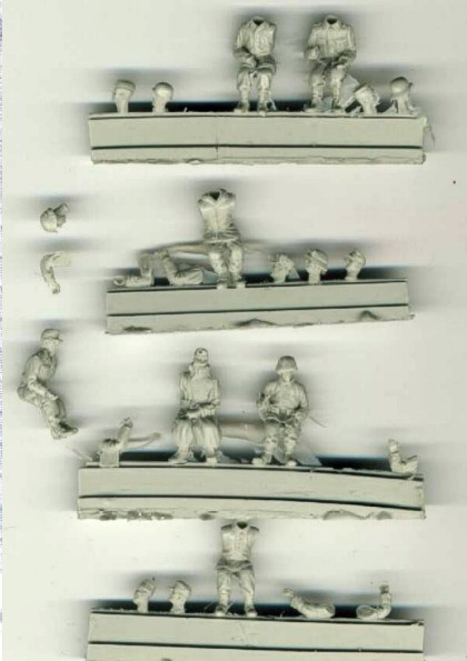 | Kvalita | Tento figurkový set obsahuje celkem 7 velice detailně propracovaných figurek odlitých z resinu. Figurky představují sedící řidiče v různých uniformách. 4 figurky jsou bezhlavé a je k nim možno vybrat hlavy z 10 různých variant (s různými helmami, čapkami a dokonce jednu s fezem). 2 figurky jsou bezruké a 3 jednoruké, což umožňuje možnost přilepení rukou v patřičném úhlu dle modelu, který budou řídit. Některé části figurek jsou zality resinovým filmem, který je však velice tenký a jeho odstranění nebude žádný problém. Jedna z figurek má v hlavě drobný otvor po bublině, ale ten se dá také jednoduše zatmelit. Některé části jsem v sáčku našel již (zřejmě vlivem transportu) odlomené od licích ”špalíčků”, což nepřináší žádný závažný problém. Jde spíš o to, neztratit je! |