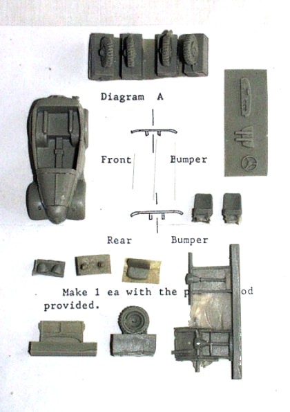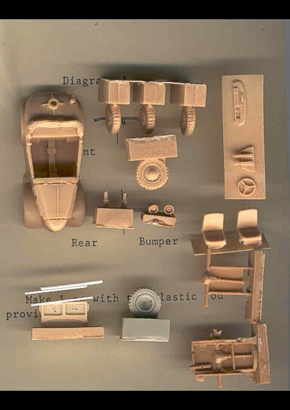 Obě vozidla jsou obdobná, proto jsou i stavebnice koncipovány shodně. Větší díly jsou relativně čistě odlity bez bublinek a s minimem otřepů. Menší díly /zejména volant a přístrojová deska/jsou však zality silnějším resinovým filmem, který může méně zkušenějším modelářům způsobit problémy. V sáčcích s modely najdete také tří plastové tyčinky pro výrobu os kol a nárazníků. |