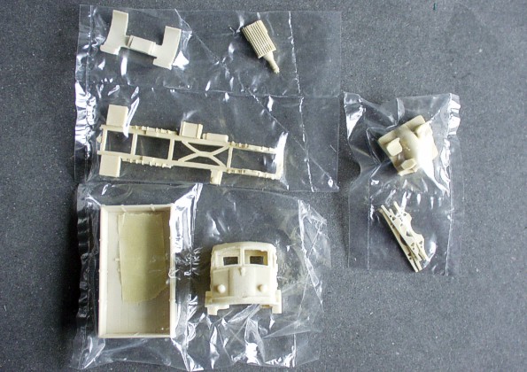 | Kvalita | Čistě odlité díly ze žlutého resinu s minimem otřepů, bez bublinek. Jednotlivé díly jsou dosti masivní a působí hrubě. Jak je již zvykem u modelu fy Doc Models, pneumatiky jsou vyrobeny z černé pryže. Drobné detaily bude nutné dodělat (zrcátka, stěrače apod.) Figurky jsou již popsány jako samostatný set. |