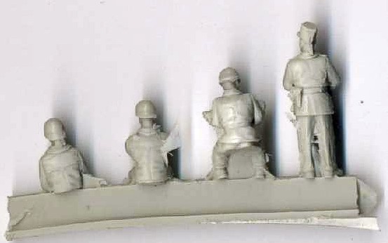 | Kvalita | Tento figurkový set obsahuje celkem 4 detailně propracované figurky čistě odlité z resinu, bez bublin, jen s drobnými přelitky a otřepy. V setu najdete kompletní figurku a dvě ”torza ” tankistů v typických přilbách. Kompletní sedící tankista je pravděpodobně řidič a ”torza” jsou určena pro umístění do poklopů. Čtvrtou figurkou v setu je ”univerzální” důstojník v typické képi s dokumenty v rukou. |