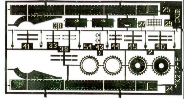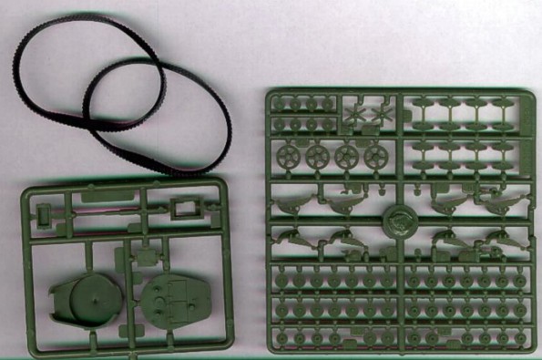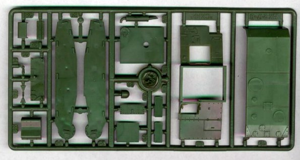| Kvalita | Výlisky z tmavozeleného polystyrénu jsou rozloženy do 3 rámečků. Model je na své nevelké rozměry tvořen až překvapujícím množstvím dílů. Většina z nich připadá na poměrně složitý podvozek. Díly jsou vylisovány jemně a kvalitně, s odpovídajícími detaily. Součástí modelu je poměrně velká planžeta fotoleptaných dílů (blatníky, různé kryty, anténa pro velitelskou verzi atd.). Pásy jsou bohužel vinylové, ale vylisované již spojené, takže stačí je pouze navléknout na hotový podvozek. Za další nedostatek modelu považuji skutečnost, že poklopy na věži jsou provedeny v jednom kuse s věží. Poklop řidiče je naopak vylisován odděleně. Obrysová přesnost modelu je velmi dobrá. |