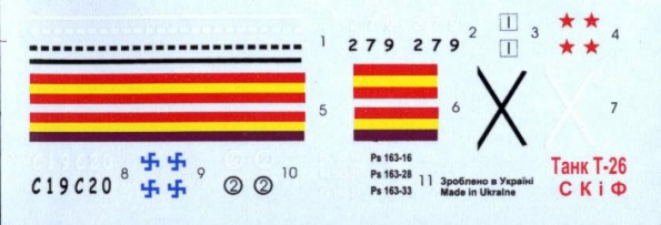 | Obtisky | Velký obtiskový aršík nabízí T-26 předválečné Rudé armády, republikánského i nacionalistického Španělska a Finska. Soutisk barev je špičkový. |