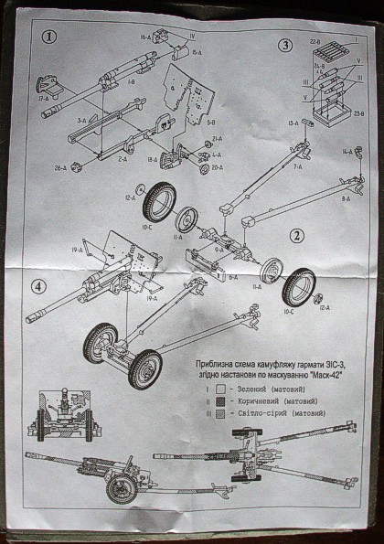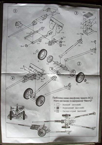| Stavební návod | Návod ve 4 jazycích je velmi podrobný a přehledný. Obsahuje též kamuflážní schéma kanónu v předválečné tříbarevné kamufláži, za války však tyto kanóny byly v naprosté většině pouze zelené. |