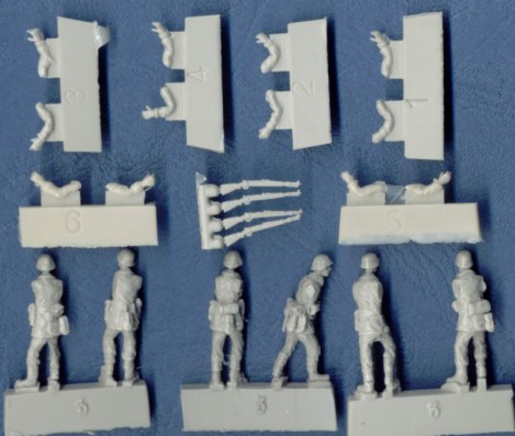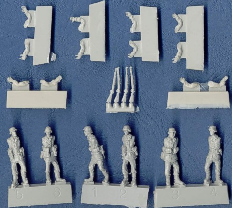 | Kvalita | Tento set obsahuje šest detailně propracovaných figurek německých vojáků v uniformách z druhé poloviny 2. Sv. války. Figurky jsou čistě odlity jako “bezruké”. Ruce jsou odlity zvlášť stejně jako zbraně. V mém setu jsou bohužel jen čtyři pušky a dva samopaly PM 40 v něm schází, proto je na obrázcích nenajdete. Na odlitcích nenajdete žádné bublinky a pouze minimální množství otřepů a přelitků. |