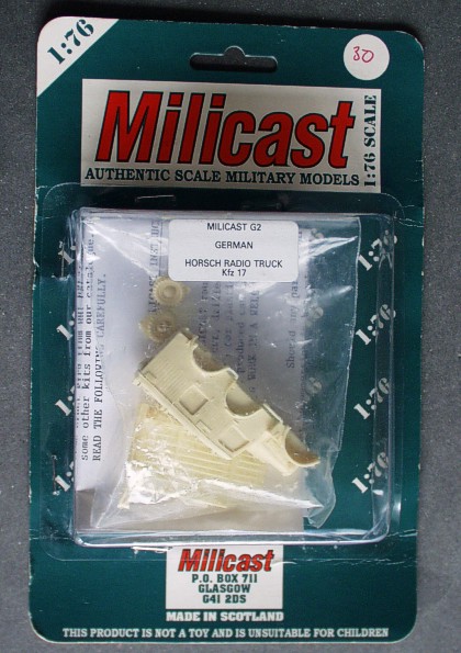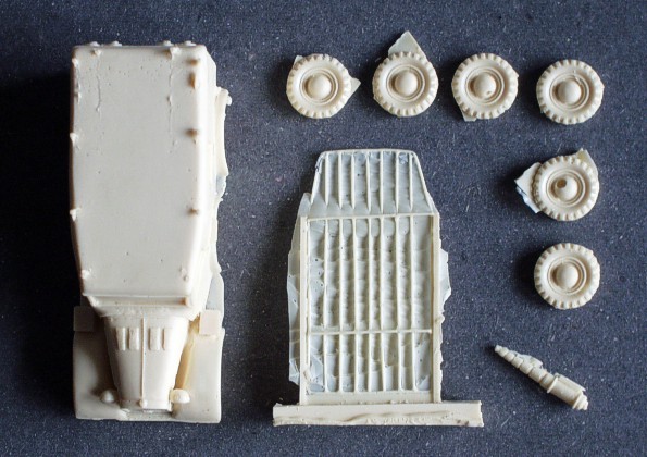 | Kvalita | Resinové díly jsou čistě odlity, bez bublinek, mají však množství otřepů, které je nutné odstranit. Je velmi jednoduchý, skládá se pouze z 9 dílů. Spíše připomíná model pro Wargames. Korba je jeden kus, bez interiéru a nemá také znázorněn podvozek. Kola se lepí na tupo. Všechny drobné detaily (zrcátka, policajty apod.) je třeba doplnit. |