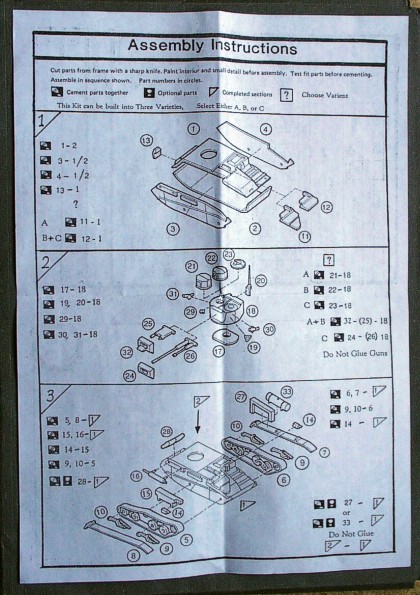| Kvalita | Velmi kvalitní a detailní výlisky, bez otřepů a viditelných vad. Velikou výhodou je možnost postavit tento tank v jedné ze tří používaných verzí, neboť výlisky obsahují patřičné díly pro každou z nich. Nevýhodou je značná tloušťka jednotlivých dílů a nepříjemné je také to, že všechny poklopy jsou vylisované jako zavřené. Některé drobné detaily bude potřeba dodělat dle fotografií. |