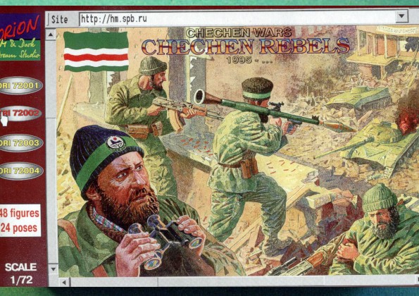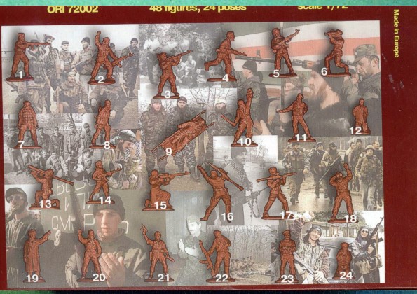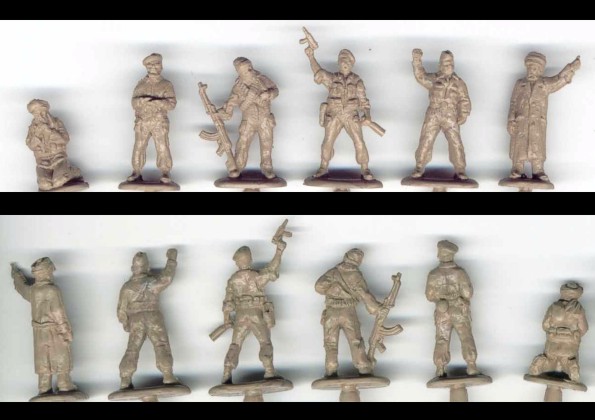 | Kvalita | Tento figurkový set obsahuje celkem 48 figurek /2x24 póz/. Figurky představují čečenské separatisty z období od roku 1995 do současnosti. V podstatě všechny figurky mají “akční” pózy, ale v setu najdete in pár figurek v pózách “klidových”. Kvalita figurek je dobrá, mají pěkné detaily a jsou čistě odlity bez výrazných otřepů a přelitků. |