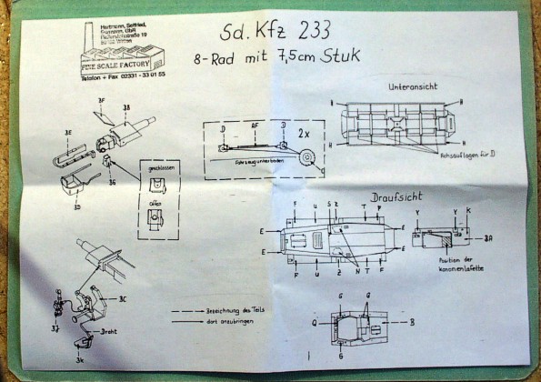 Sestavením tohoto skutečně výborného modelu získáme vozidlo známé jako Schwere Panzerspähwagen (7.5cm) Sd.Kfz.233 (8-Rad), čili těžký obrněný průzkumný automobil, vyzbrojený 75mm kanónem. Vozidlo bylo určené jako doprovodná zbraň průzkumných jednotek pro boj s tanky a obrněnými vozidly nepřitele. Domnívám se, že bylo nasazeno na všech frontách včetně severni Afriky. Známé jsou fotografie kde američtí vojáci prohlížejí ukořistěné Sd.kfz.233 v Tunisku a Sd.kfz.233 míjejíci it. samohybné dělo L40 da 47/32 na podvozku lehkého tanku L6/40. Obě vozidla jsou z 10. Panzer Division. |
