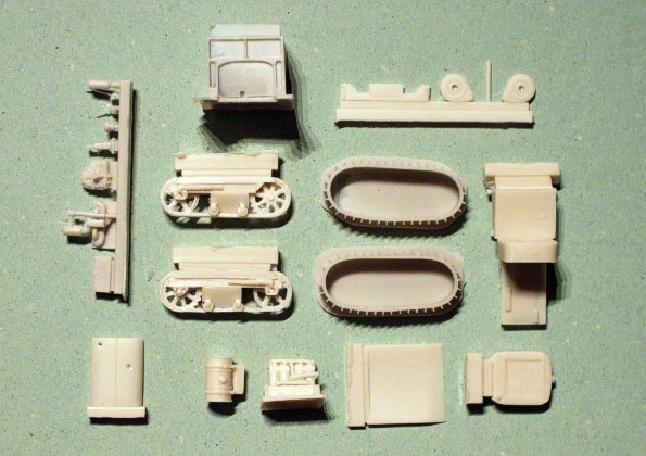 | Kvalita | Všechny resinové díly jsou odlity velice jemně a čistě. Nenajdete na nich žádné bubliny, ani výrazné přelitky. Z většiny dílů bude potřeba pouze masivní licí nálitky, což však nepředstavuje výrazný problém. Kabina řidiče je odlita jako jeden dutý díl, podvozek se sestává pouze ze dvou dílů, ale je bez problémů použitelný. Řešení pásů je velice zajímavé a jednoduché. Stačí s nich jen odbrousit výrazný nálitek a napasovat je na podvozek. Stavebnice obsahuje i díly pro kompletní motor! Planžeta jemně leptaných dílů obsahuje okenní rámy, boční kryty motoru a další doplňky pro exteriér vozidla. |