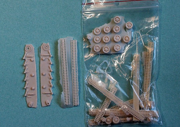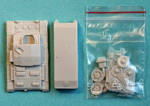 | Kvalita | Jednotlivé díly stavebnice jsou relativně čistě odbity z resinu. Nenajdete na nich takřka žádné bubliny, avšak větší množství přelitků a otřepů. Všechny menší díly včetně dílů podvozku jsou zality v resinovém bláně. Odstranění těchto nedostatků by však nemělo zkušenějšímu modeláři činit vetší problémy. Korba vozidla má bohužel všechny poklopy ztvárněné jako uzavřené, což bohužel znemožňuje případné umístění figurek posádky. Pásy jsou odlity v páscích, které je nutno před přilepením na podvozek vytvarovat v horké vodě. Všechny díly, jsou provedeny vcelku detailně a jsou bez problémů použitelné. Preciznější modeláři si ale možná některé z nich raději vyrobí znovu. |