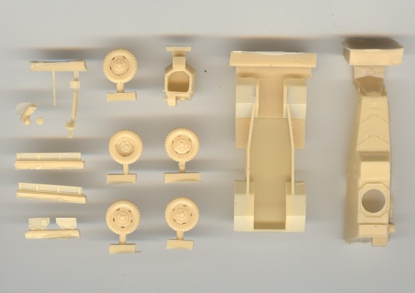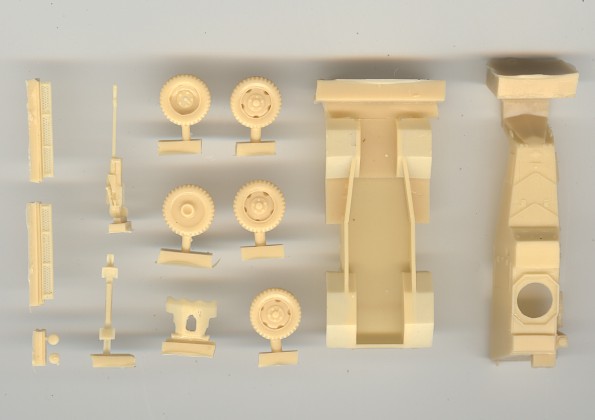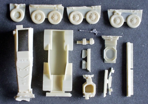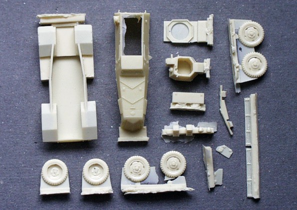| Kvalita | Resinové díly jsou velice čistě odlity, bez bublinek a otřepů, ze všech však bude nutné odtsranit technologické nálitky. Všechny díly mají velmi kvalitní povrch. Drobné detaily (antény, nářadí apod.) bude nutné doplnit z vlastních zásob nebo vyrobit nové. PT puška z bílého kovu je po začištění také použitelná. Velice dobře a detailně je odlit i PT kanón Hotchkiss. |