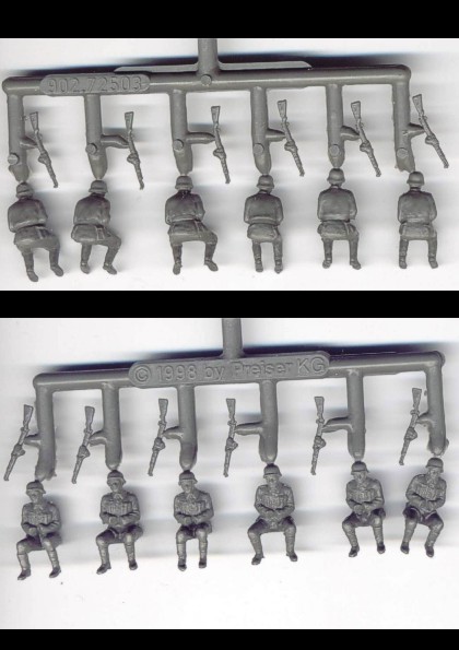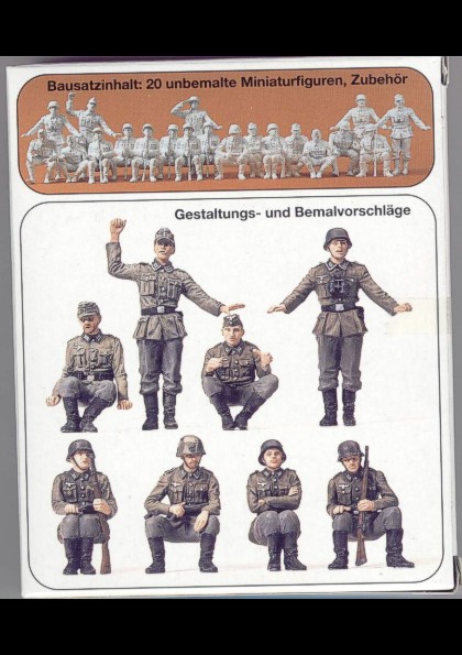 | Kvalita | Tento skvělý figurkový set obsahuje 5 rámečků s díly pro celkem 20 různých sedících figurek německých granátníků z období 2. sv. války, kteří jsou určení pro kolopásové obrněné transportéry. Figurky mohou být ale také použity do nákladních aut , či do jiných vozidel, případně na jiná místa. Každá figurka je v podstatě samostatnou stavebnicí protože musí být sestavena z několika dílů. V setu tedy najdete samostatné hlavy, trupy, ruce, nohy atd. Set nabízí i dostatečné množství alternativních hlav, takže své figurky můžete sestavit buď z hlavou v lodičce, čapce, či ocelové helmě. Set obsahuje také dva rámečky s doplňky, tzn. se zbraněmi (přestože již jsou součástí figurek), sumkami, lopatkami, plechovkami na masky atd. Figurky si tedy můžete ”ověšet” dle potřeby! |