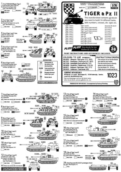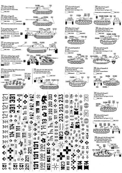 | Kvalita | Tento aršík obsahuje obtisky pro 34 různých Tigerů a lehkých tanků Pz. II a pro 2 kořistní tanky T34 v německých službách. Kvalita obtisků je vysoká, soutisk je dobrý a tištěná vrstva je velmi tenká. |
