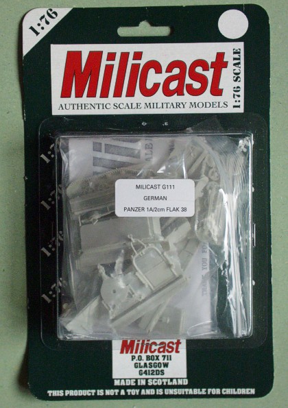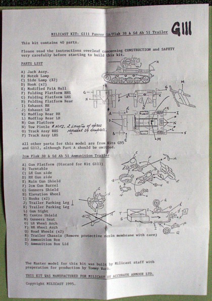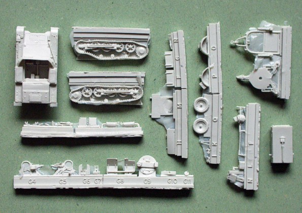 | Kvalita | Stavebnice se skládá z relativně velkého počtu dílů vcelku čistě odlitých ze světlešedého resinu. Na některých dílech najdete jemné otřepy a většina jemných částí a mezery a otvory v dílech větších jsou zality jemnou resinovou blánou. Některé z delších a tenčích dílů /včetně pásů/ jsou zohýbány a je třeba je narovnat v horké vodě. Největšími díly stavebnice jsou korba vozidla s naznačeným interiérem a bedna muničního přívěsu. Oba jsou odlity jako jeden kus s větším nálitkem na spodku. Pásový podvozek se sestává pouze ze dvou dílů – kola a pasy jsou odlity společně. Všechny uvedené i další díly jsou dle mého názoru bez problémů použitelné. Snad možná resinovou hlaveň 2cm kanónu bych doporučil nahradit hlavní mosaznou nabízenou Milicastem zvlášť, jako příslušenství. |