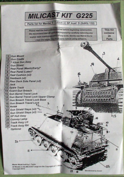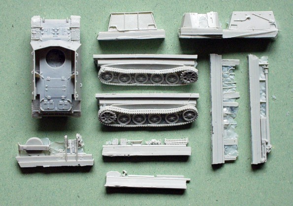 Stavebnice se skládá z relativně velkého počtu dílů vcelku čistě odlitých ze světlešedého resinu. Na některých dílech najdete jemné otřepy a většina jemných částí a mezery a otvory v dílech větších jsou zality jemnou resinovou blánou. Některé z delších dílů jsou lehce zohýbány a je třeba je narovnat v horké vodě. Největším dílem stavebnice je korba vozidla, odlitá jako jeden kus s větším nálitkem na spodku. Podvozek se sestává pouze ze dvou dílů – kola a pasy jsou odlity společně. Všechny uvedené i další díly jsou po začištění, dle mého názoru, bez problémů použitelné. Pouze v případě, že si chcete postavit modelovější kousek, tak vám doporučují ztenčení hran příliš silného bočního a zadního /pokud stavíte verzi “late”/ pancíře a hlavně štítu kanónu. Pokud se rozhodnete stavět verzi “early”, tak vám doporučuji úpravu dílu zadního “koše” tzn. jeho vylepšení opravdovou síťovinou z plastu nebo kovu, protože to dodá celému modelu mnohem realističtější vzhled. |