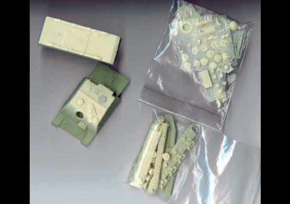 | Kvalita | Jsou uloženy v igelitových sáčcích. Korba s nástavbou je odlita ze dvou dílů a je dutá, což umožňuje vybavení interiéru. Model obsahuje velké množství drobných detailů, včetně variabilních pro několik verzí (kola s gumovým obložením i celoocelová, dvě varianty výfuků atd…), ženijní nářadí, představné pancíře atd…Odlitky jsou poněkud hrubší a potřebují začistit, jsou ale velmi dobrým základem pro přesný a věrný model. Zimmerit je znázorněn také věrohodně. |