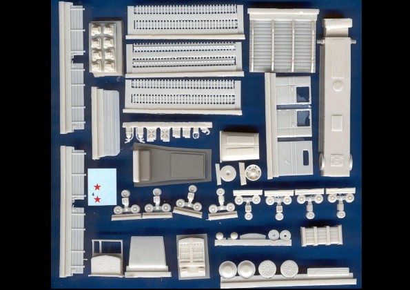 | Kvalita | Tato resinová stavebnice je koncipována takřka jako plastový kit. Obsahuje relativně velké množství plochých dílů, ze kterých je třeba sestavit nejen korbu, ale i kabinu řidiče a kapotáž motoru. Nejmasivnějším dílem je rám podvozku. Pásy jsou odlity v páscích, které je nutno před nalepením na kola vytvarovat po ohřátí fénem nebo v teplé vodě. Potěšilo drobné příslušenství, jako např. kanistry, has. přístroje atd. Všechny díly jsou odlity velice jemně a čistě. Nenajdete na nich žádné bubliny, ani výrazné přelitky. Největším problém při přípravě dílů pro vlastní stavbu tedy zůstává odstranění relativně masivních technologických nálitků. Čirá fólie k ”zasklení” oken není součástí stavebnice! |