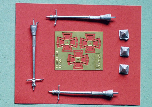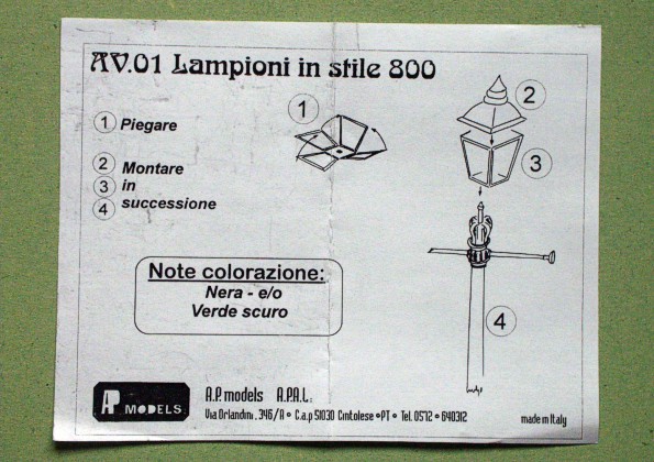 Tento set obsahuje odlitky a leptané díly pro tři pouliční lampy. Jedná se o lampy ve stylu 19, století, ale podobné lampy se běžně nacházely na mnoha místech ještě ve století minulém. Výrobce doporučuje nabarvit lampy černě, nebo tmavě zeleně. Čirou folii pro imitaci skla v setu nenajdete. Domnívám se, že tento vhodně rozšiřuje nabídku doplňkových setů pro diorámy. |