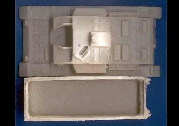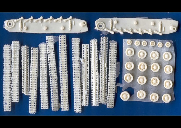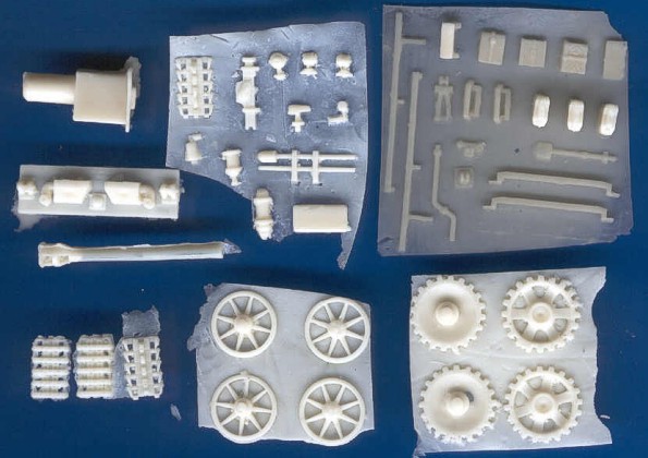 | Kvalita | Jednotlivé díly stavebnice jsou relativně čistě odbity z resinu. Nenajdete na nich takřka žádné bubliny, avšak větší množství přelitků a otřepů. Všechny menší díly včetně dílů podvozku jsou zality v resinovém bláně, která je někde až příliš silná. Odstranění těchto nedostatků by však nemělo zkušenějšímu modeláři činit vetší problémy. Korba vozidla má bohužel všechny poklopy ztvárněné jako uzavřené, což bohužel znemožňuje případné umístění figurek posádky. Pásy jsou odlity v páscích, které je nutno před přilepením na podvozek vytvarovat v horké vodě. Všechny díly, jsou provedeny vcelku detailně a jsou bez problémů použitelné. Preciznější modeláři si ale možná některé z nich raději vyrobí znovu. |