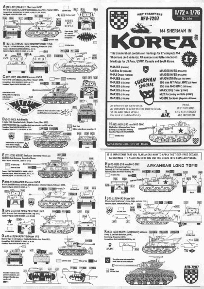 Vzhledem k velikosti některých emblémů a malůvek /tlamy, tygří hlavy atd./ jsou tyto koncipovány tak, že je třeba kombinovat obtisky s dle návodu předem nabarvenými místy. Toto není zrovna jednoduchá činnost, proto bych ji nedoporučil začátečníkům. Já osobně plánuji stavbu všech “tlamatých” Shermanů, které v něm najdu!J Děkujeme firmě AFV Decals za vzorek zaslaný k recenzi a těšíme se na anoncovaný set Korea 2 s M24 a dalšími kousky! |