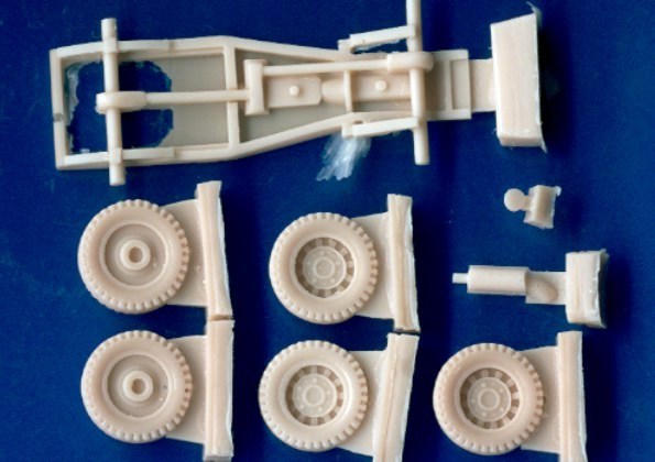 | Kvalita | Díly stavebnice jsou odlity z resinu neurčité barvy ve velmi dobré kvalitě. Resinových dílů je celkem devět – korba, podvozek, pět kol, výfuk a část světlometu. Planžeta leptaných dílů pak obsahuje vše ostatní – díly pro věž včetně 7,62 mm kulometu DT, blatníky, masku chladiče, nářadí atd. Model jsem přesně neměřil (ono taky na pěticentimetrovém trpaslíkovi jaksi není co měřit), ale po porovnání hlavních dílů s mi dostupnými výkresy by měl odpovídat své skutečné předloze. |