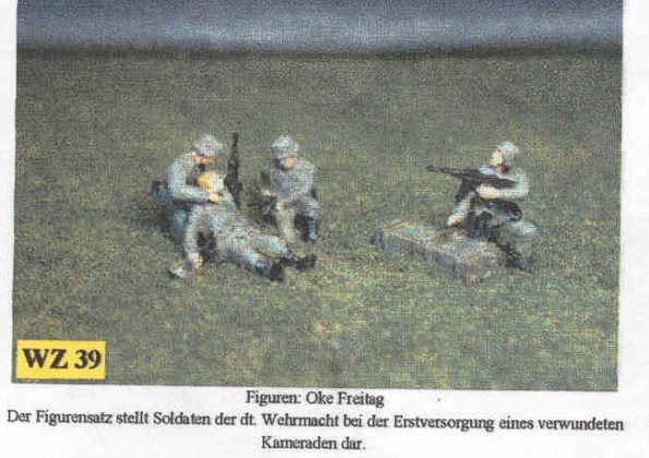 | Kvalita | Tento figurkový set obsahuje 4 figurky představující německé vojácky poskytující první pomoc raněnému druhu. Figurky mají velmi realistické pózy, ale jsou bohužel velmi hrubé v detailech a ne příliš kvalitně odlity. Drobné doplňky /zbraně atd./mají spoustu přelitků a jejich začištění bude asi náročnější. |