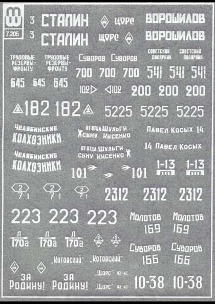 | Kvalita | Aršík nabízí, alespoň pokud jsem dobře počítal, marking pro celkem 22 vozidel. Konkrétně se jedná o T-34/76 (7x + 1x OT-34), T-34/85 (7x, z toho 2x verze s kanonem D5T), KV-1 (5x), a po jednom kusu KV-8S, KV-85 a SU-152. Obtisky se jeví rozměrově přesné, většina z nich není nabízena výrobci stavebnic příslušných typů. Jsou-li mé informace správné, potom stejný aršík nabízí i ruská firma Micro World. |