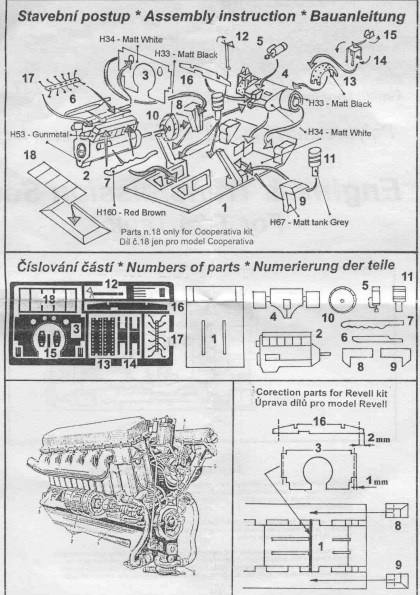 Vzhledem k tomu, že se kity Cooperativa/AER a Revell rozměrově liší, dodává výrobce dvě uložení motoru a návod, jak některé díly upravit, aby sedly do Revellu. jako malý bonus jsou do setu přidány tři německé kanystry! |