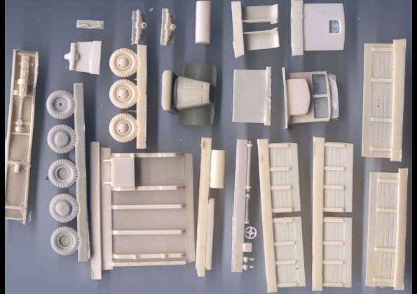 | Kvalita | Stavebnice obsahuje cca 40 dílů vcelku kvalitně odlitých z resinu. Stavba modelu by neměla být nijak náročná. Na problém jsem však narazil při kontrole přesnosti dílů podvozku /zjevně chybně vycházejí z podvozku ZIS-5 od AER/ a u kol. Ani jedno bohužel neodpovídá dostupným výkresům publikovaným v čas. M-Hobby ani fotografiím skutečného vozidla. |