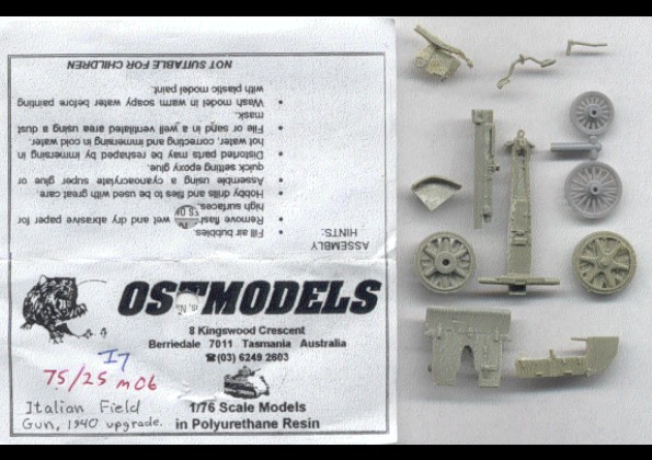 s pneumatikami, tak jak je zobrazuje tento model. Dělo je původně vyvinuté z německého Krupp 7.5 cm M.1906. Během 2. světové války jich několik použili Němci pod označením 7.5cm FK 237(i). Dělo můžete nabarvit tříslovou barvou pro Afriku nebo Itálii, nebo šedozelenou barvou pro Evropu. Já se domnívám,že sloužilo na všech frontách: v Africe, na Balkánu, v Itálii a v Rusku. |