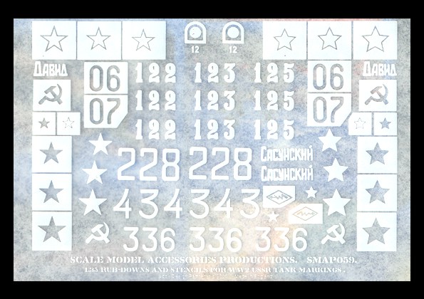 | Celkový dojem | Výborná věcička pro ty, kteří nemají rádi klasické mokré obtisky. Zvláště bych ocenil srpy a kladiva, protože většina obtisků v modelech ani doplňkových setů tento sovětský symbol neobsahuje. Jedinou výtku bych měl k tomu, že když firma SMA vyrobila tento aršík jako zmenšeninu stejného aršíku 1/35, mohla si dát pozor, aby se nápis "1/35" neobjevil i na propisotu 1/72. |