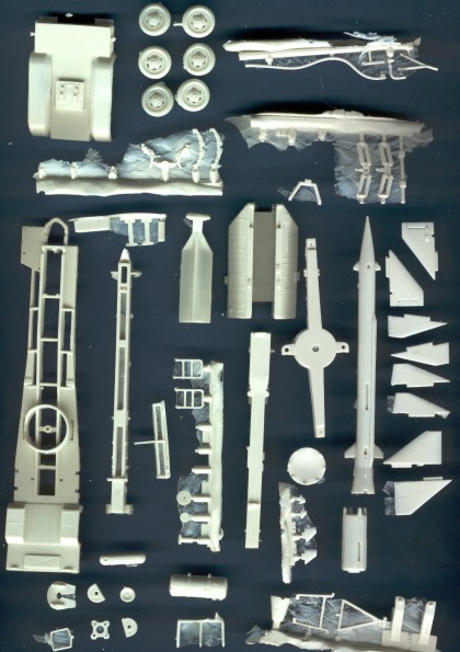 Jedná se o konverzní set , který je třeba doplnit o plastovou stavebnici tahače Zil 157, respektive a jakoukoli verzi tohoto náklaďáku (cisternu, raketomet... ) , který se na trhu vyskytuje pod hlavičkou několika firem. MAC, Omega-K, ICM ... V setu najdete krom dílů pro úpravu tahače i komplet přivěs pro raketu a odpalovací zařízení i transportním podvozkem. Z jednotlivých dílů je na první pohled patrné, že konverze "vychází" ze staršího platového kitu od fy Airfix. Tento je ale uváděn v měřítku 1/76, což by mohlo kolidovat s rozměry tahače, který je deklarován 1/72. Předpokládám ale , že potřebné díly jsou patřičně upraveny. Bude tedy záležet až na výsledném modelu, zda k sobě díly sedí, či nikoli. Jinak všechny díly jsou čistě bez bublin odlity z bílého křehkého resinu s minimem problémových nálitků a otřepů. Některé menší jsou zality velmi jemným filmem. Začištění dílů před stavbou by tedy nemělo představovat výrazný problém. |