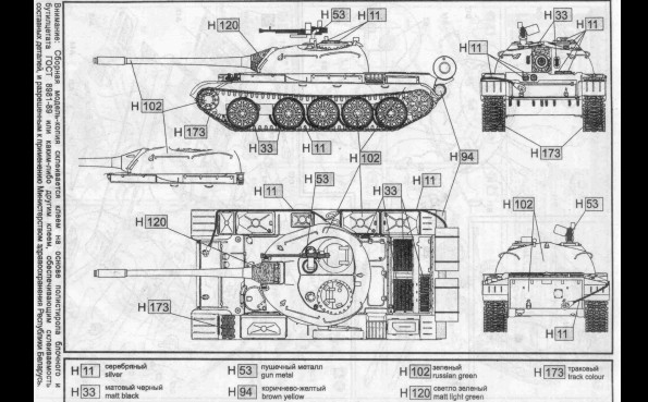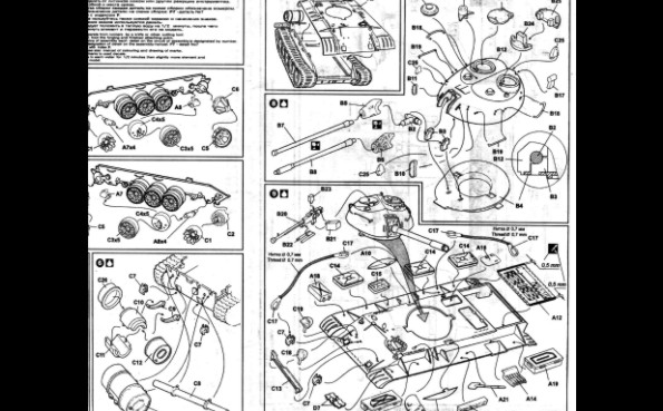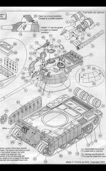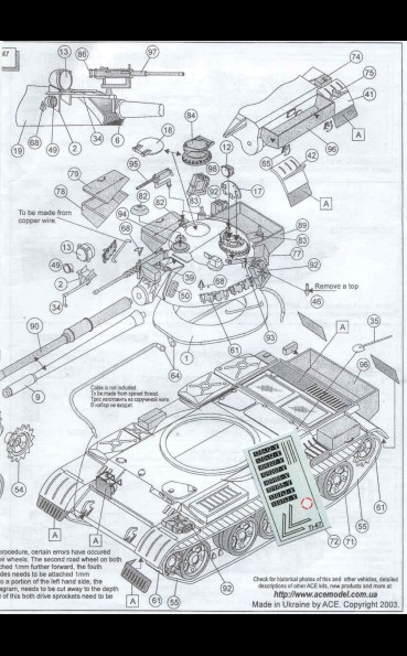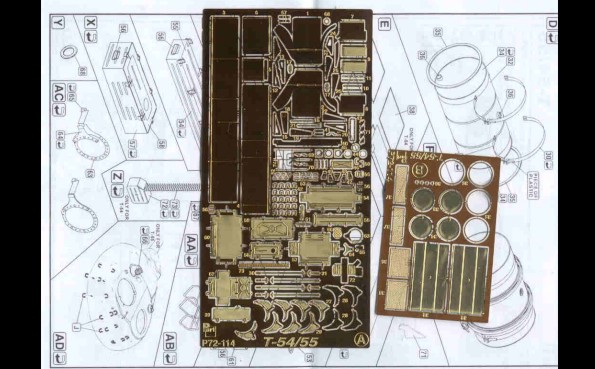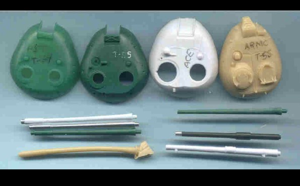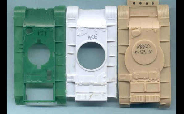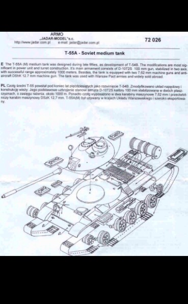 Recenze dvou známých plastikových stavebnic doplněná o srovnání s resinovým kitem T-55A od fy ARMO ÚVOD Tento článek by měl být srovná momentálně dostupných stavebnic /od PST, ACE a ARMO/ známého sovětského tanku T-54/55 v měřítku 1/72.Oba modely PST sdílejí většinu dílů, a tak recenze jednoho bude zároveň recenzí druhého. To platí i pro modely ACE založené na bázi T-55, přestože ACE přikládá ke každému modelu i rámeček s díly pro danou variantu. Momentálně ACE nabízí sedm variant T-55: T-54A, T-55, izraelský Ti-67, Typ 59 (čínská kopie T-55), irácký T-55 Enigma, OT-55… PST nabízí T-54/54A a T-55, lišící se koly, věží, hlavní. Na trhu jsou i vyprošťovací vozidla. ARMO nabízí T-55A, jedinou verzi T-55 o které jsem věděl, dokud se neobjevily modely ACE a PST. Mým cílem je pomoci ostatním modelářům vybrat si z nabídky modelů, pomoci mu postavit lepší model tím, že se vyhne nástrahám a překvapením, kterým jsem se já nevyhnul. Druhou samostatnou kapitolou tohoto článku bude stavební recenze! TROCHA HISTORIE Tank T-54 se zrodil po 2.sv.válce postupným vývojem z typu T-44. Jeho přednosti byly podvozek z torzních tyčí, 100mm dělo /z SU-100/ a nízký profil lité věže. Základními identifikačními znaky byl kanón bez úsťové brzdy, paprsková kola /ala T-34-85/ a ventilátor ve stopě věže umístěný pře poklopem nabíječe. Hlavními znaky typu T-55 jsou 100 mm dělo s typickou úsťovou brzdou, nová hvězdicová kola a věž bez stropního ventilátoru. Polní úpravy a modernizace mohou samozřejmě uvedené znaky popřít. Tanky T-54/55 se vyráběly po 20 let v SSSR, Polsku , Československu a Číně (zde jako Type 59 & Type 69) a celkem jich bylo vyrobeno přes 100.000 kusů. Sloužily pak /a někde ještě slouží/ v mnoha zemích světa. Mnoho z nich bylo upraveno a modernizováno a vzniklých verzí je příliš mnoho na to, abych se jimi zabýval do detailu. ČTYŘI KITY T-55 Enigma od ACE (#72152) znázorňuje irácké vylepšení tohoto starého vozidla tak, jak bylo zajištěno koaličními jednotkami ve válce v Zálivu v roce 1991. Jedno je ve Spojených Státech v Aberdeen Proving Grounds, jedno je v muzeu v Bovingtonu. Přídavný pancíř je z laminovaného hliníku a pokud vím, byl vysoce účinnou obranou proti střelám HEAT.. Tanky Enigma a Tiran/níže/ mohou být postaveny na základu T-55 nebo čínského typu 59 či 69. Tiran 4/5 (#72157) je izraelským vylepšením sovětských tanků z let 1968-1973. Ti-4 je z ukořistěného T-54 a Ti-5 z T-55. Jsou známy také pod názvem Ti-67. Tanky jsou vyzbrojeny buď původním dělem nebo novým 105mm kanónem. T-55 od PST (#72046 a #72045) již byly recenzovány a proto se jim nebudu věnovat, mimo přímé srovnání s modely ARMO a ACE. Viz sekci odkazů na reference uvedené v závěru. Kit ARMO T-55A (kit 72026) představuje T-55 model 1970, což bylo vylepšení modelu 1958. T-55A je snadno rozeznatelný díky anti-radiačním prstencům okolo věžiček. Pěkná věž od ARMO ale postrádá pár detailů, např. dva periskopy. STAVEBNÍ NÁVODY Návody stavebnic ACE obsahují pěkné “rozstřely” dílů a podsestav, ukazující, které díly a jak použít. Nahoře vlevo jsou instrukce pro umístění doplňkového pancéřování u Enigmy, nahoře vpravo pro Ti-67. Ti-67 nabízí obtisky pro tři stroje, Enigma nenabízí žádné. Modely PST nabízí marking pro pět vozidel (viz. http://www.ontheway.us/reviews/PST/T54-55prev.htm ). Model ARMO neobsahuje žádný marking. Nahoře je část návodu T-54 od PST. Povšimněte si, že věž se jeví oblejší než ve skutečnosti a že velitelský poklop větší než ve stavebnici. Celkově je návod srozumitelný. Opět nahoře tentokrát návod ARMO. Není tak komplikovaný jako PST a ACE. DÍLY STAVEBNICE Nahoře jsou díly přídavného pancíře u Enigmy, s velmi pěknými detaily. V mé stavebnici bylo mnoho otřepů, plastik je velmi měkký. Pancíř se zdá být OK, pouze na bocích korby se jeví tenký. Nahoře jsou díly izraelského Ti-67. Opět je zde spousta otřepů a plast je měkký, detaily nejsou tak ostré jako u PST. Úplně vlevo je zelený 105mm kanón, který jsem ukradl z Abramsu od Hasegawy, vedle je kanón ze stavebnice ACE. Díl od Hasegawy je mnohem lepší. Ve stavebnici jsou jak 100, tak 105mm kanóny a přídavné boxy dvou velikostí, takže lze postavit Ti-4 I Ti-5. Všimněte si velmi pěkně propracovaných kulometů. KORBA Nahoře jsou obrázky korby PST (vlevo), ACE uprostřed a ARMO. Všechny tři se jeví jako odpovídající. Jsou patrné rozdíly v detailech např. Poklopů a předních blatníků. I přes rozdílnost nelze říci, že by některá z věží vysloveně neodpovídala skutečnosti. Prstenec věže PST je menší než ACE, která je blíže skutečnému T-55. Viděl jsem dvě fotografie ukazující tuto část a ta je skutečně větší než to, co nabízí PST, navíc umístěno více ve středu korby. To se jeví jako důležité při pozdější stavbě. PST má ostřejší detaily, tenčí plastik a méně otřepů. Navíc nabízí oddělené kryty motorů. Návod upozorňuje na nutnost odřezání 0,5mm na každé straně. Slyšel jsem hodně kritiky na tuto chybu, ale je třeba si uvědomit, že ACE nás nutí změnit pozici torzních tyčí, což je podobná chyba. Slyšel jsem hodně kritiky na přesnost detailů PST. Obě korby se jeví podobné, jen PST je trochu detailnější. Nejsem expert na T-54/55 jako S. Zaloga a C. Sewall, ale vzhledem k tomu, že tank byl vyráběn ve čtyřech sovětských továrnách a čtyřmi dalšími zeměmi, nedivil bych se, kdyby se kus od kusu lišily. Na obrázku nahoře je vidět, že kryty motoru kitu ARMO zasahují více dopředu než u PST a ACE. Při stavbě modelu ARMO nespoléhejte na to, že zvýšený kruh na korbě je středem věže, 