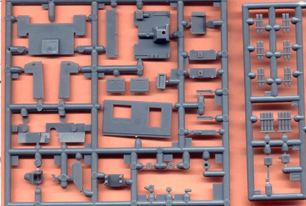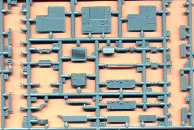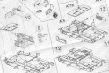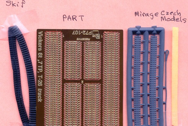 Dílů je tolik, že jsem je ani nepočítal, bude jich ale přes 125. Všechny jsem velmi detailní a jemně provedené. Spojení s licími rámečky je velmi tenké, což umožňuje snadné oddělení jednotlivých dílů. Vozíky podvozku jsou samostatné, což umožňuje i stavbu modelu s podvozkem kopírujícím nerovnosti terénu. Houfnice 76.2-mm a kulomet 7.62-mm jsou taktéž detailně propracovány a to včetně munice. Gumové pásy jsou pružné a také vypadají dobře. Ještě jsem žádný kit od Mirage (T-26 nebo 7TP) nestavěl, takže nemohu komentovat sesazení dílů atd. Tato stavebnice vychází ze starších kitů 7 TP & Vickers E a T-26, sdílí s nimi tedy většinu dílů. Obrázek s pásy od několika výrobců, nám umožňuje dostatečné kvalitativní srovnání. Pásy od MIRAGE, každopádně vycházejí , ze všech pásů dodávaných v kitech nejlépe. Leptané pásy od PARTu jsou pak samostatnou kapitolou a měly by se dát použít na modely všech tanků konstrukčně vycházejících z typu Vickers E, tzn., také na T-26, 7TP eventuelně i na starší kity M13/40 a Semovante 75/18 ode ESIC. |