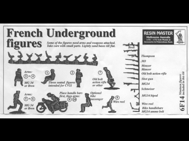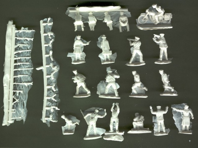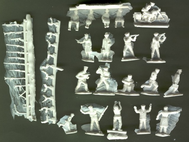 | Kvalita | V setu najdete celkem 19 figurek, jejichž předlohy evidentně vznikly úpravou figurek od Airfixu, Matchboxu atd., jsou vcelku čistě a bez bublin odlity z křehkého bílého resinu. Ruce a zbraně pro některé z figurek jsou odlity zvlášť a postavy je třeba sestavit. Většinu dílů pokrývá nevzhledný film, který však nepředstavuje výrazný problém, neb je velice jemný a snadno odstranitelný. Pózy některých figurek jsou trochu křečovité, většina ale ujde. |