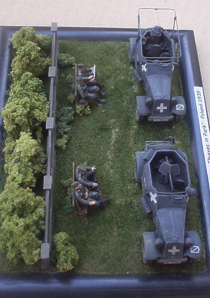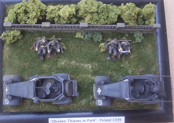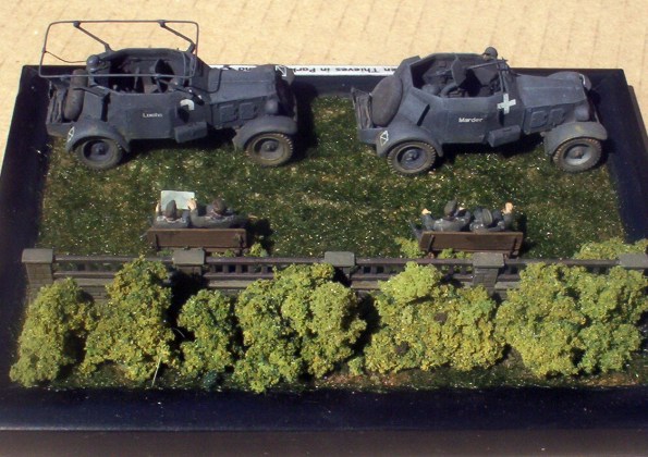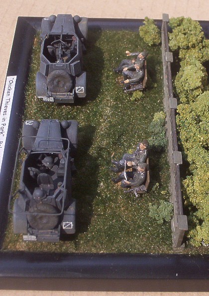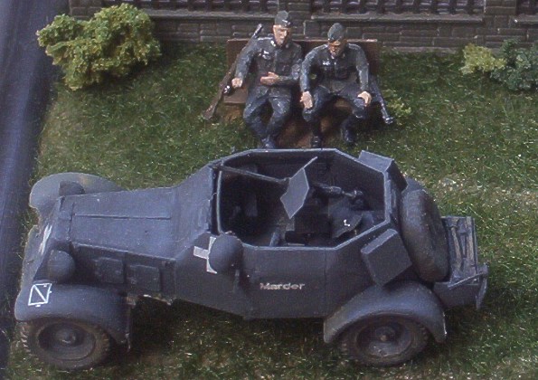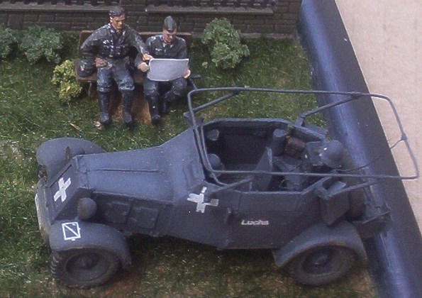 Stavebnice německých lehkých průzkumných obrněných automobilů Adler Kfz. 13 & 14 od firmy MMS jsem představil zde. Jejich stavba pro mě nebyla zas tak příjemná a rychlá, jak jsem přepokládal. ne, že by to bylo tím, že by kity byly špatné, spíše to bylo tím, že jsem z kovové modely stavěl poprvé. Nejpracnější pro mě bylo začištění jednotlivých dílů a pak tmelení. Bílý kov je totiž relativně měkký materiál, který se snadno ohýbá a je citlivý na vrypy /i nehtem/. Po několika hodinách "boje" jsem ale obě vozidla sestavil a doplnil několika nově vyrobenými. U Kfz. 13 to byl kulomet MG.13 včetně štítu a u Kfz. 14 rámová anténa včetně nosníků. U obou vozidel pak ukazatele směru. Protože jsem se rozhodl své modely umístit na malé dioráma, bylo nutno připravit figurky a další drobnosti. Figurky osádky jsem vytvořil úpravou jednoho ze setů od MMS. Zbraně pocházejí z téhož setu. U dvou figurek jsem použil jiné hlavy od Milicastu a SMA/SSP. Lavičky jsou scratchbuilt a zídka pochází z jakéhosi "vláčkařského" vyrobeného kdysi v NDR. Po nabarvení jsem oba modely doplnil přilbami a Kfz.14 mapou a sluchátky vysílačky.Jedné z figurek /původně řidič/jsem vložil do rukou mapu. Vše dohromady jsem pak umístil na malé dioráma představující německé vojáky odpočívající v jednom z varšavských parků. Dioráma jsem nazval "Chicken Thieves in Park - Zdoději kuřat v parku" a to proto, že se mi to jeví docela příhodné vzhledem k pojmenování vozidel /Marder - kuna a Luchs - liška/ .J Závěrem bych chtěl poděkovat kolegovi Mittemu za výrobu obtisků na "Luchse". Obtisky na "Marderovi" jsou ze setu od AFV decals. Over |