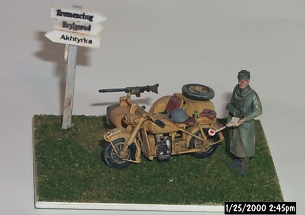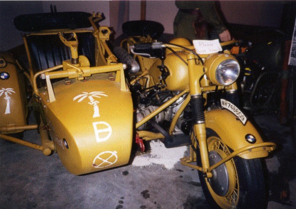fy Hasegawa, ovšem z modelu Vojenský policista řídící dopravu stojí u sajdkáry BMW R75, východní fronta, 1943-1944. [Fografie: by S. Brezinski ]Podlahu přívěsného vozíku je třeba doplnit proužky plastu simulujícími dřevěné latě, které tam byly umístěny. Motocykl je proveden v barvě používané od roku 1943, tzn. v evropské žluté /zde v akrylátovém provedení/. Pneumatiky jsou natřeny tmavě šedou. Helma umístěná na sedadle řidiče pochází z nějaké figurky z měkkého plastu. ”Motorkářský” kabát byl často vyráběn z pogumované látky, proto jsem ho natřel pololesklou šedozelenou. Kola jsou vylisována plná, bez výpletu. Pro vydlabání plastu mezi vidlicemi a okolo kol doporučuji použít skalpel č. 11. Vyhloubené mezery doporučuji vyplit tmavou barvou. Stavebnice obsahuje i celkem slušně provedený kulomet MG34, ale přesto doporučuji jeho nahrazení kulometem z ”hakly” od ESCI. Model vhodně oživí i brzdná a radící lanka z jemného drátku. Fotografie restaurované sajdkáry BMW 75R v markingu DAK, Wright Museum, Wolfboro, NH, USA. Povšimněte si detailů držáku MG34 a olejových skvrn na podlaze. Použitá barva připomíná spíše evropskou žlutou, než africkou pískovou.Závěrem shrnuji, že tento model je pěkný a dobře se staví. Hotový model odpovídá velikostí danému měřítku, proto je obtížné ho vůbec vidět, natožpak hodnotit. Jinou recenzi tohoto modelu od Douga Chaltryho najdete na: http://www.ontheway.us/reviews/Hasegawa/kubelBMWreview.htm |