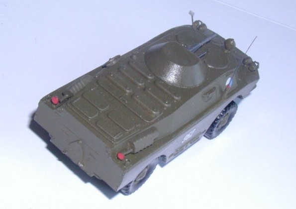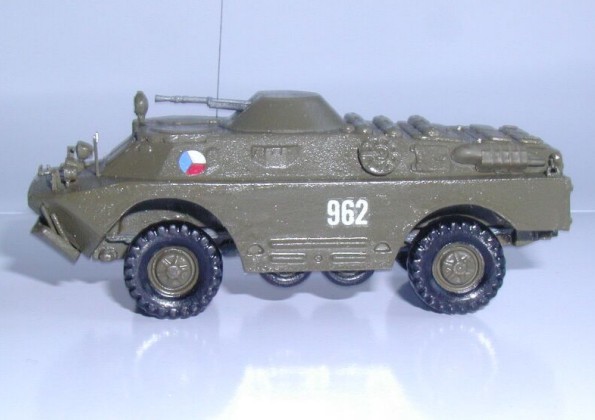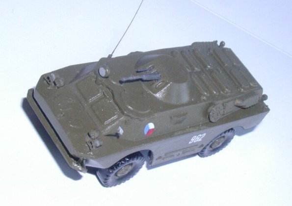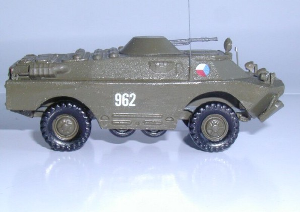 webu. Obtisky jsou z modelu - obě kokardy mají stejnou orientaci (velmi častá vada východních výrobků), takže jsem je musel rozstřihnout a znovu složit. Číslice zbyly z modelu BTR-152 Model má klasické jednoduché zbarvení khaki a označení znaky a číslicemi jsem udělal podle fotky jiného modelu z webu, neboť sám nemám žádné foto pro průzkumnou variantu tohoto nádherného obrňáčku v našich službách. Stroj je jako ze škatulky v "přehlídkovém" zbarvení prost jakýchkoliv odřenin, šmouh, zablácení. Model je postaven z krabičky bez větších úprav. Popravdě, ale větší úpravy výlisků musíte podniknout už pro pouhé sestavení modelu z krabičky. Model není zrovna vzorem přesnosti a čistoty jednotlivých dílů. Hlavně jejich sestavovací hrany potřebují mnoho pozornosti od Vašeho pilníku, žiletky a pilky. Obrysovou přesnost jsem nezkoumal i když nějaké nákresy k dispozici mám. Malé BRDM-2 jednoznačně svými tvary vystihuje svou předlohu. K dispozici na trhu jsou i resinové modely od polské firmy Armo, ty však mají detaily daleko hrubší a od modelu ACE se i rozměrově liší, takže jejich kombinaci ve vitrínce nedoporučuji. Nerad bych vypadal jako nekritický milovník ruské techniky, ale zrovna BRDM-2 považuji za velmi povedený, jednoduchý a účelný stroj. Výrobce mezitím přišel s dalšími verzemi tohoto modelu a tak bych rád tomuto stroji do vitrínky přidělal ještě další bratříčky: SA-9, BRDM-2rch, BRDM-2 s AT-5. Dnes je tento stroj dočasně nejmodernějším v mé mini sbírce pozemní techniky čs. armády. |