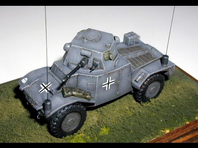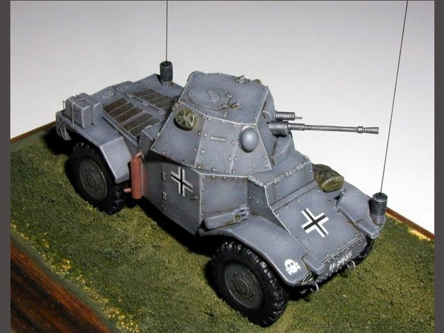 Měřítko: 1/72 1/72 Použitá stavebnice: Extratech Celý model je odlitkem z PUR a je doplněn o leptané kovové díly a obtisky pro 3 kamuflážní verze. Odlitky jsou kvalitní a bez bublin. Jediným nešťastným řešením je umístění nálitku na korbě vozidla, který zasahuje přes nýtované čelo a záď. Kovové díly, které obsahují kromě blatníků, listová pera i další detaily pasují na model dobře. Kamufláž je dle fotografie konkrétního kořistního vozidla používaného ve Francii v roce 1940 jednotkami SS. |