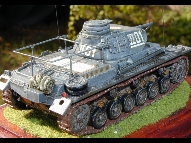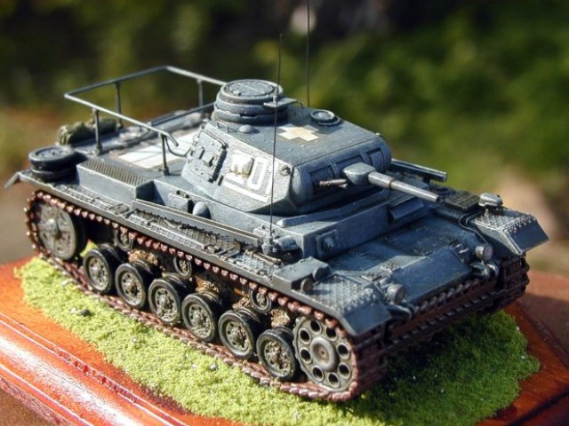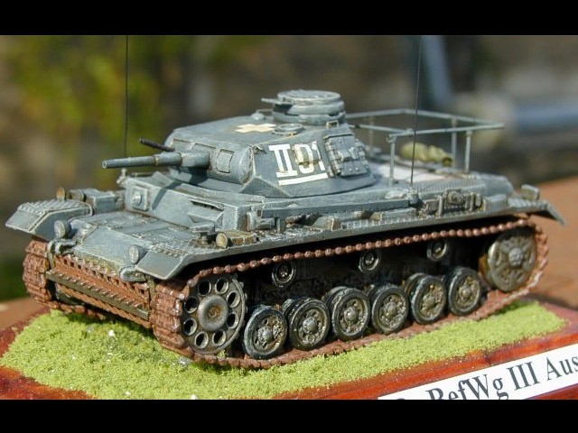 Měřítko: 1/72 Použitá stavebnice: Attack Stavba tohoto modelu se nijak neodlišuje od předchozího modelu Ausf. E. Rozdíly jsou jen v doplnění rámové antény a antén na bocích korby. Anténu jsem zhotovil z drátu, přesto, že stavebnicová se dala použít. Při volbě kamuflážního schématu se mi zalíbil stroj od 1. pancéřové divize z Polska. Kamufláž tohoto stroje jsem nalezl asi ve třech publikacích. Pokaždé se odlišovala. Na tento stroj jsem nalezl i foto v publikaci In Action věnované tanku Pz.Kpfw III. |