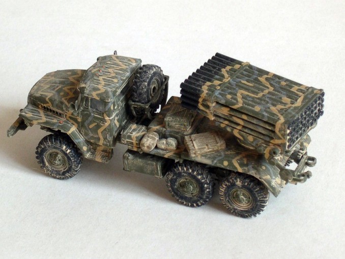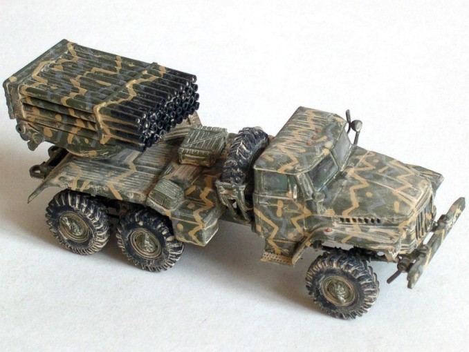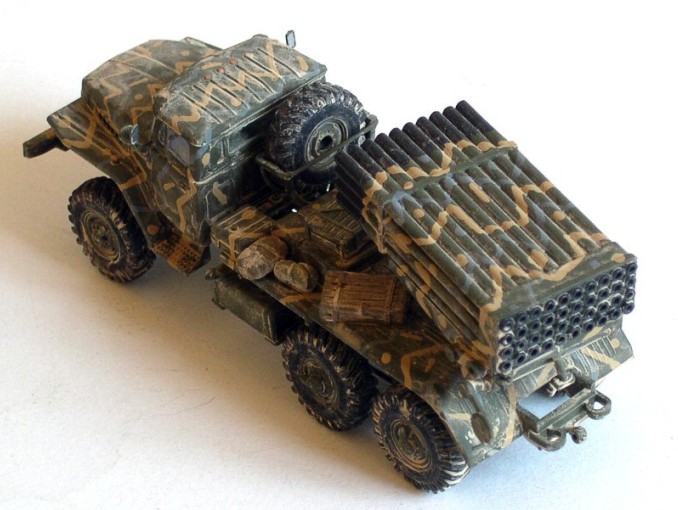 Model vznikl konverzí ze dvou stavebnic, Ural 375 D od ZV Models a Grad-21 fy Modelism. Doplnil jsem nějaké bedny a bagáž.