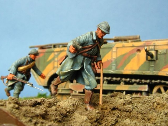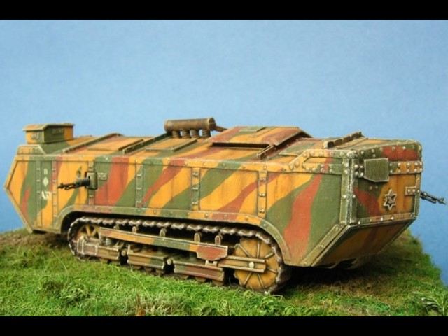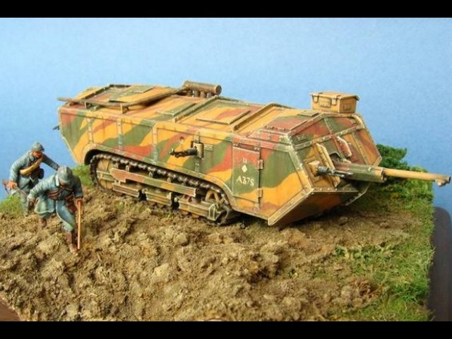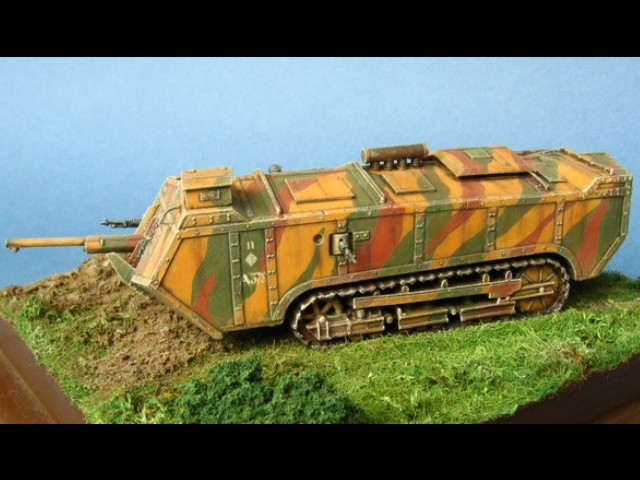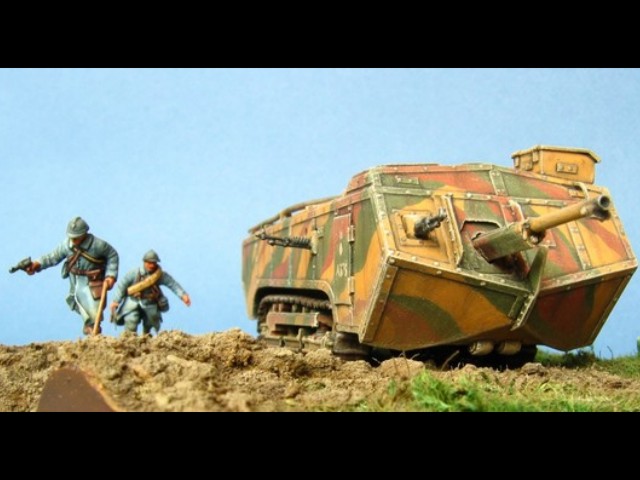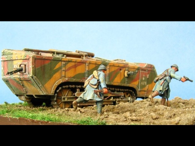 Měřítko: 1/72 Tento model představuje jeden z francouzských tanků Saint-Chamond pomáhajících odrazit německý útok na město Compiègne během bitvy u Matz v červnu 1918. Model je s drobnými úpravami postaven z resinové stavebnice fy JMGT. Figurky vojáků vznikly úpravou figurek od Preiseru. |