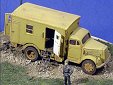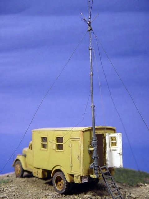 Měřítko: 1/72 Použitá stavebnice: ESCI Stavebnice Ambulance Opel Blitz přestavěná na spojovací vůz, všechny vnější i vnitřní detaily jsou scratchbuilt za použití plastiku, olověné folie a měděného drátu. Anténa je také scratchbuilt z kovových trubek a plastiku. Uvnitř je všechen nábytek, rádia (včetně kabeláže a Morseova klíče) a ústředna. Figurka je „pilot Luftwaffe“ od Airfixu. |