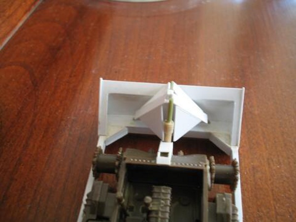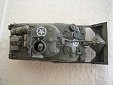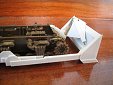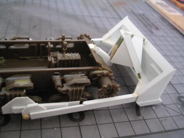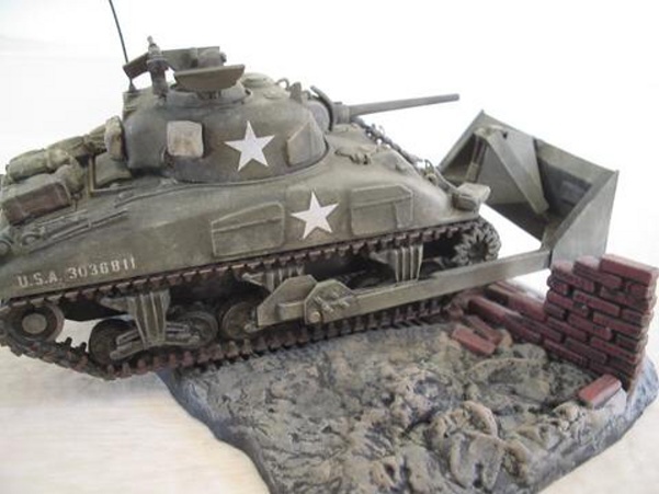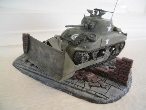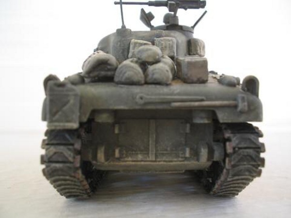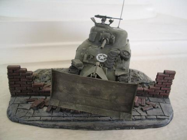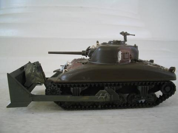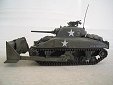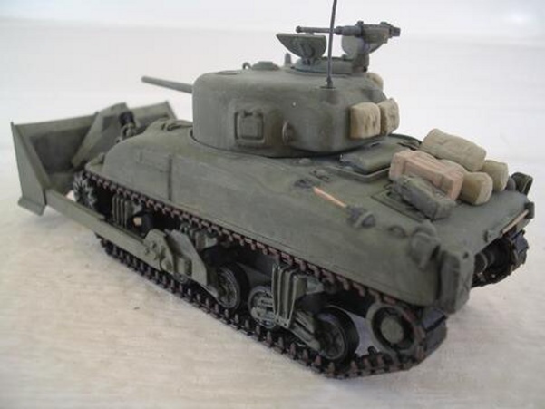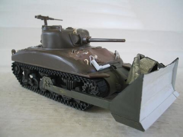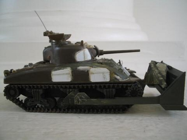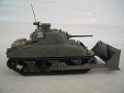 Měřítko: 1/76 Použitá stavebnice: Fujimi (pouze tank); Dozer Blade - scratchbuilt plastových destiček Stavebnice M4A1 od Fujimi je původní staré Nitto, jenž má příliš malé kola a gumové pásy. Stejně tak tvar korby není správný.Tvar věže jsem se pokusil upravit pomocí tmelu a broušení. Kola jsem nahradil kopiemi kol z Fireflyho od Matchboxu. Pásy jsem použil z M4A1 od Revellu. Přídavné pancéřové pláty jsou z platové destičky a sváry jsou naznačený pomocí vytaženého rámečku. Figurka velitele tanku je z původní stavebnice, doplnil jsem jí pouze brýle na helmu. |