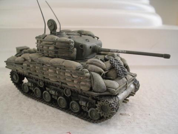 Měřítko: 1/76 Použitá stavebnice: kombinace věže z M4A1 od Revellu s korbou z M4 105mm HVSS od Fujimi Pytle s pískem přídavné ochrany jsouc vyrobeny z pomalu tuhnoucího tmelu a rámy jsou proužků plastu. Model je postaven dle jedné z barevných kamufláží v publikaci "D-day to Berlin" od Squadronu. |